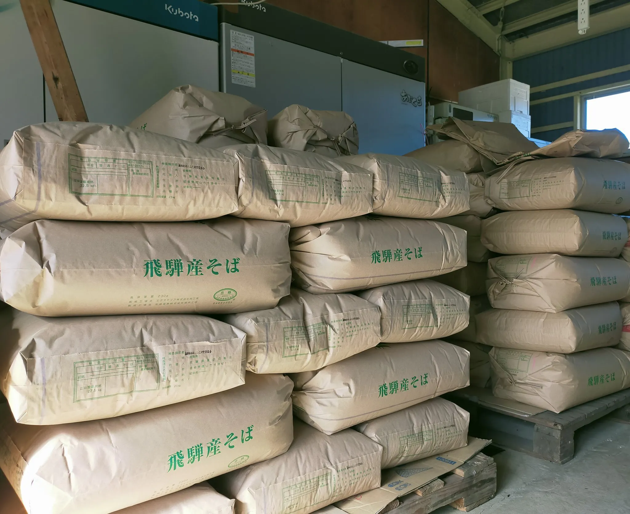 コンバインで収穫された蕎麦の実は、大きなパックに詰められています。