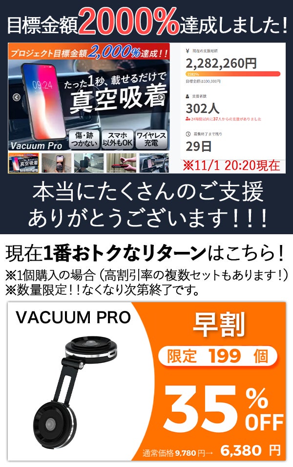 Vacuum Proプロジェクト開始から少し経ちましたが、ずっと興味を持っていただけているおかげでなんと2000%も達成致しました!!