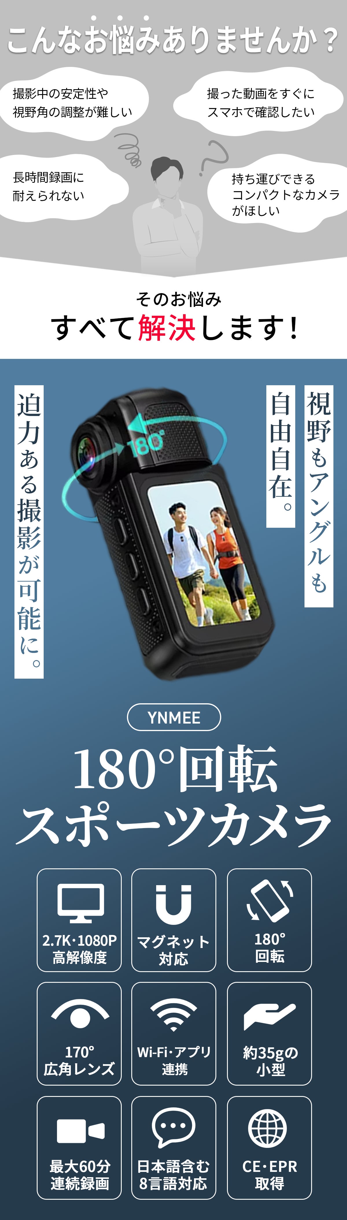 2.7K高解像度!170°の広角×180°回転でダイナミックな映像体験を実現する新世代スポーツカメラ