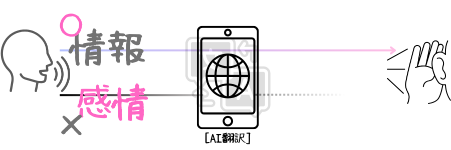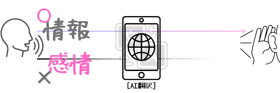 これからAI翻訳の技術はどんどん高まり、ほとんどの人が外国人との会話に翻訳機を使うようになるでしょう。しかしその場面ではいくら表情を作って自分の感情を伝えたくても翻訳機の無機質な音声や定型文が淡々と情報を発信しています。