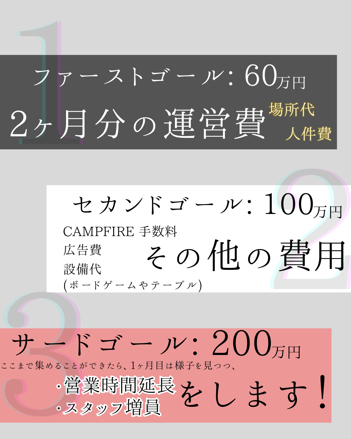 まずは最低でも必要な2ヶ月分の運営資金60万円きっかりをファーストゴールにします!