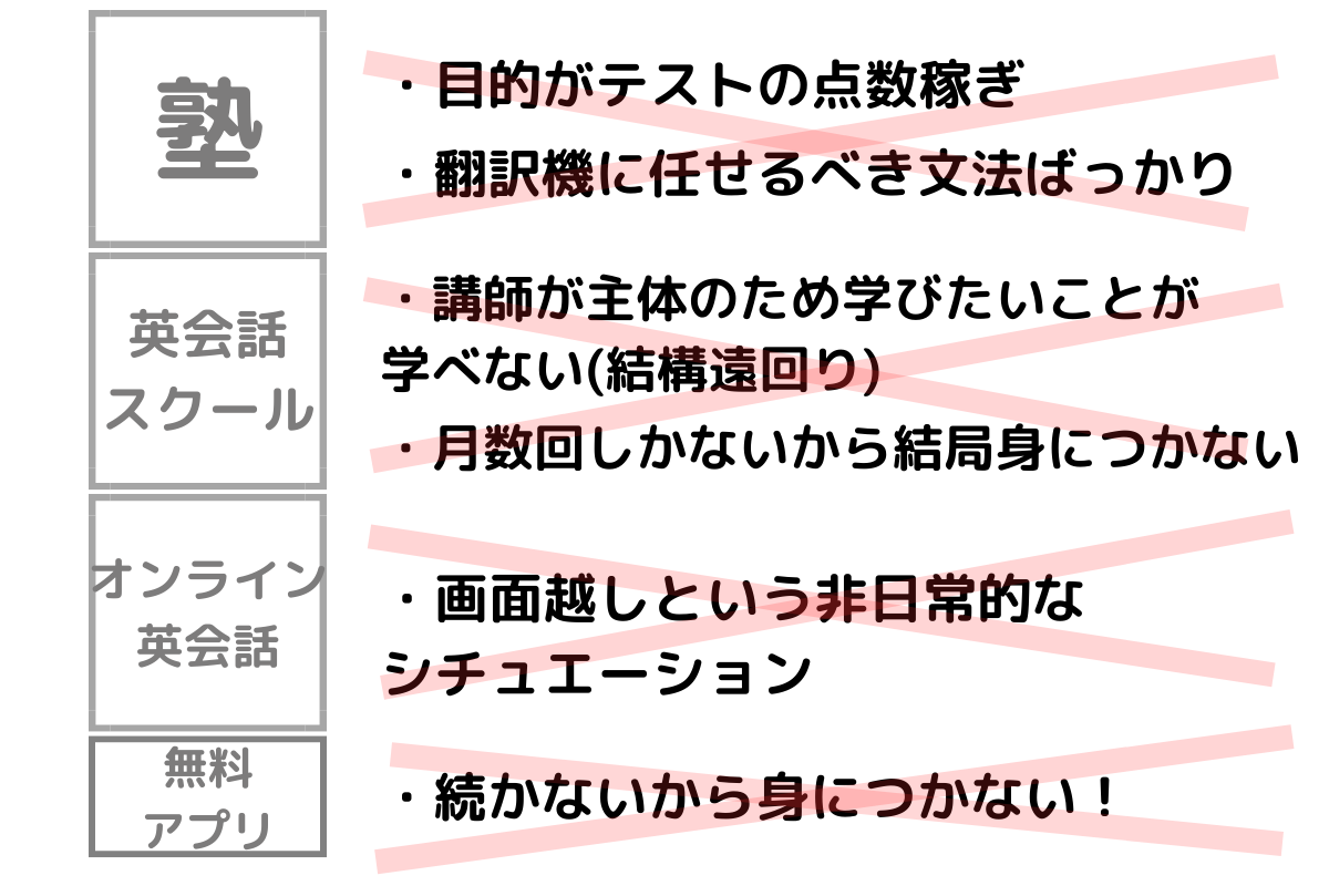 塾も英会話スクールもオンライン英会話も、さらには英会話カフェも使いました。