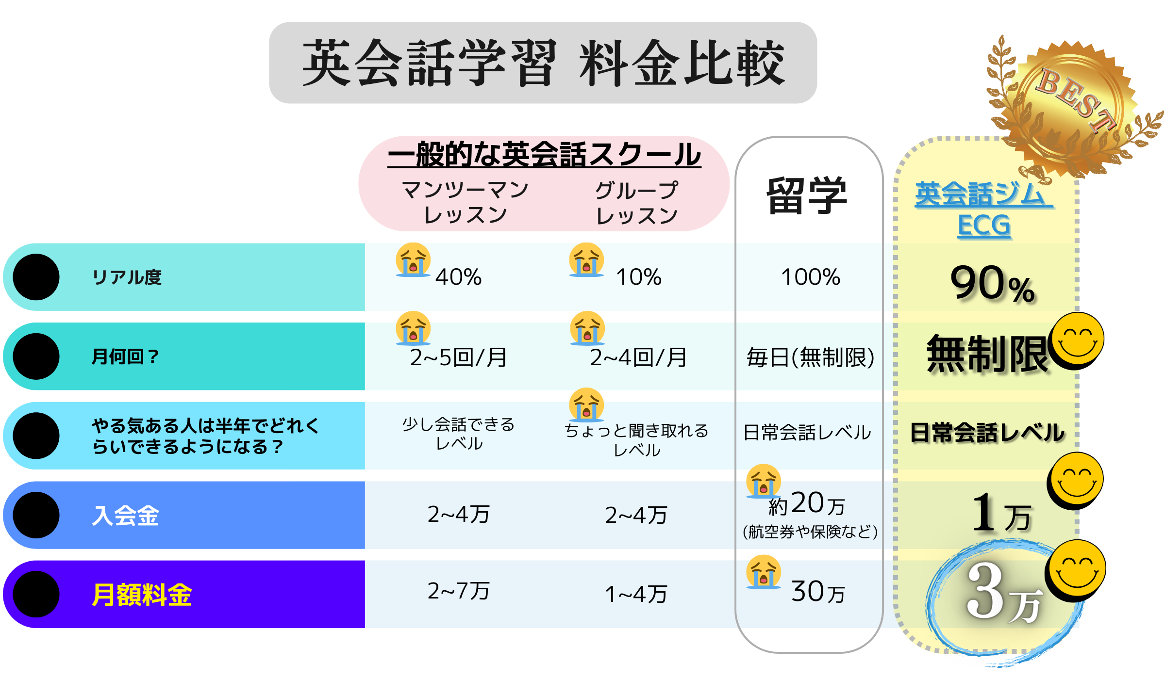 ここでは「誰も」が、「短期」で、「難しい勉強なし」で、まるで留学帰りのような英会話力をスルスルと身につけることができます。
