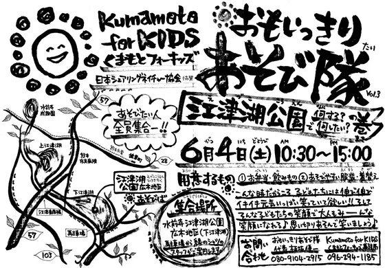 梅雨入りを目前の熊本は雨交じりの日が多くなってきましたが、被災地親子支援プロジェクトKumamoto for KIDS「おもいっきりあそび隊」は今週末は6/4(土)江津湖広木公園(熊本市)に行きます。広々とした見渡す限り空と緑の大地!親子でゆったりと自然遊びします。当日は魚釣りや、ほのぼのとウクレレ体験などなど、また八代商店街の皆様による、子どもたちのための素敵なプレゼントも予定しています。土曜日の江津湖へ、お友達ご家族、お誘い合わせの上おいでください!