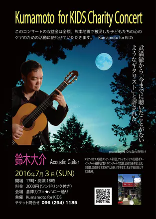 作曲家の武満徹から「今までに聴いたことがないようなギタリスト」と評された鈴木大介氏が、Kumamoto for KIDSの活動に賛同してくださり、この度、チャリティーコンサートを開催することになりました!クラシック音楽の枠に止まらず、他ジャンルのミュージシャン達とのコラボも重ねる鈴木大介氏の音楽は、聴くものをやさしく包みこみ、温かさを感じさせてくれるものです。語りかけるようなそのギターの音色に、じっくりと浸ってみませんか?