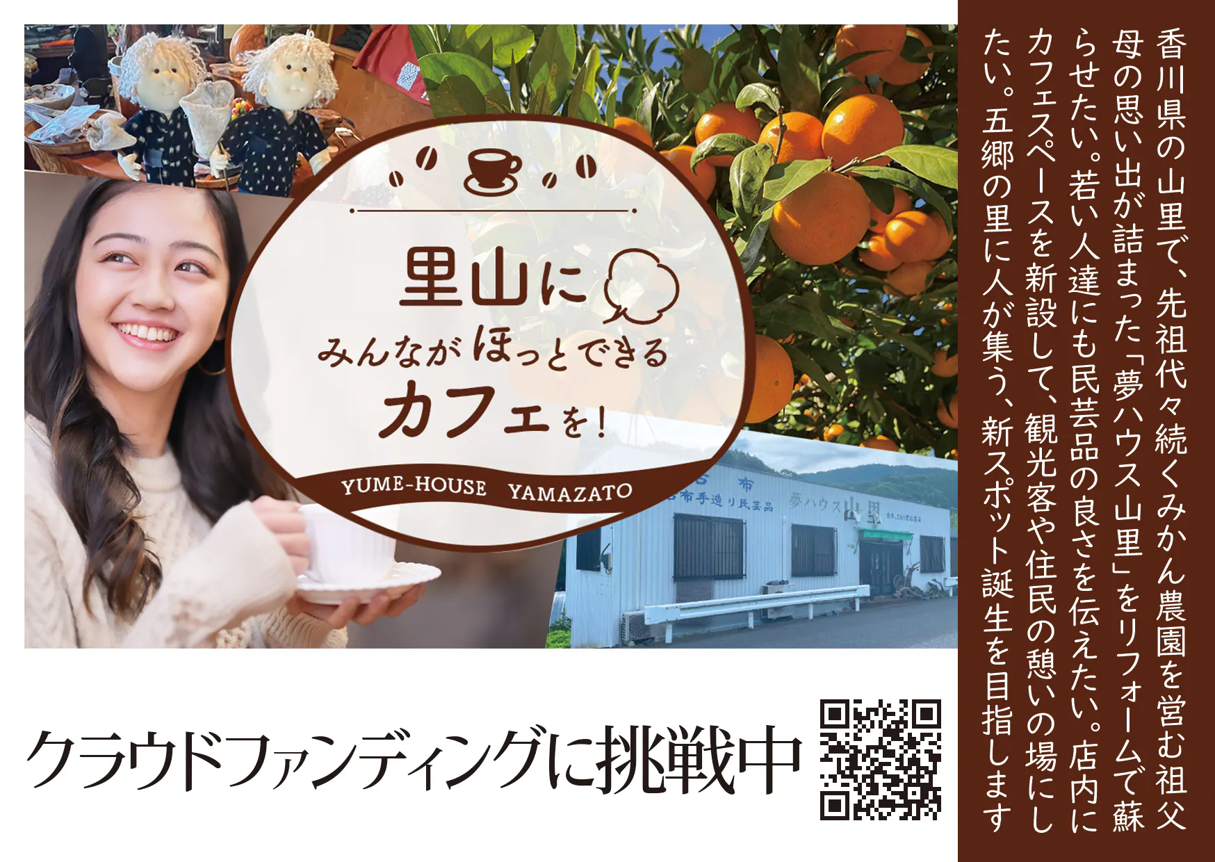 僕自身も闘病生活しながらの挑戦ですが、何とぞご協力いただけましたら幸いです。また、現在でも店舗の見学や買い物が出来ますのでぜひ、お問い合わせ下さい。支援して下さる皆さまの力で五郷に、いや、観音寺市に新たなスポットを誕生させたいと思います。