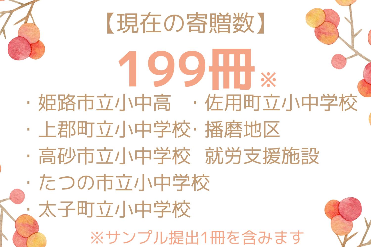 ※当初、そのように200冊を予定しておりましたが姫路市だけでなく、たくさんの小中学校のお子さまにもお喜びいただきたいと、眞砂と私の思いが溢れ・・・地域の市町村の教育委員会様にお声かけをさせていただいており最終の寄贈数は319冊になりそうです。