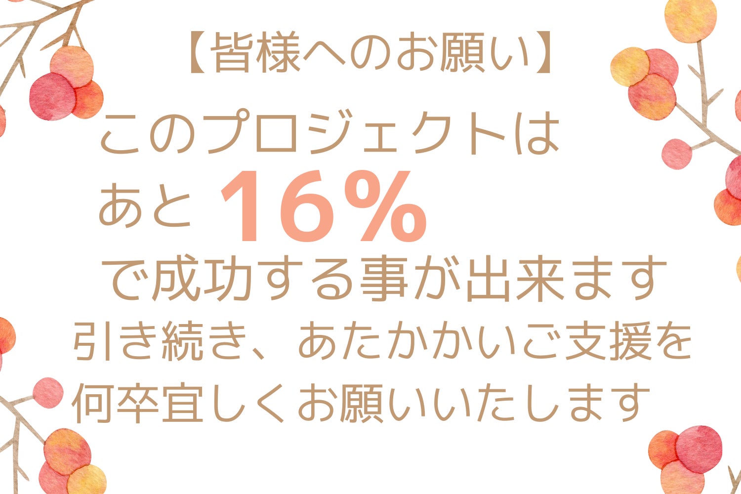 あと9日で何とか残り16%のご支援を頂戴し、プロジェクトを達成できますよう