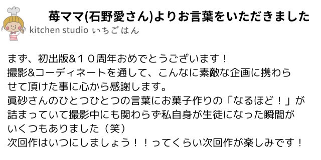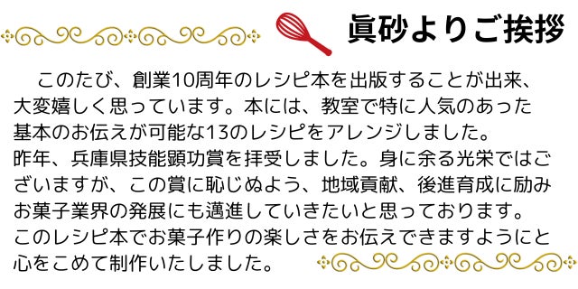 当初は10周年の記念やお菓子教室の生徒さんのために作りはじめたレシピ本でしたが、制作が進むにつれ、この本を地域の皆さまへの恩返しとして地域貢献に役立てることが出来ないか、未来を担う子どもたちがお菓子づくりを通じて家族との時間を豊かにしていただくお手伝いをさせていただきたい。さらには地域に留まらず、まだ出会ったことのない全国の皆さまにもお届けしたい。そんな想いが募ってまいりました。