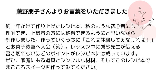 お菓子作りは自由なものだと思っています。分量を正確に測るお菓子作りと一見矛盾しているようですが、基本をマスターした後は色々チャレンジしていただき、皆さまの「ご家庭の味」が出来る事を楽しみにしています。本の中に、ご家庭の年輪として受け継いでいくレシピがあれば、こんなに嬉しい事はありません。そして、レシピにはお子さまと一緒に作っていただける簡単レシピを2種お入れしました。ご家庭で作っていただいたお子さまに「楽しい」とお感じいただけると嬉しいです。