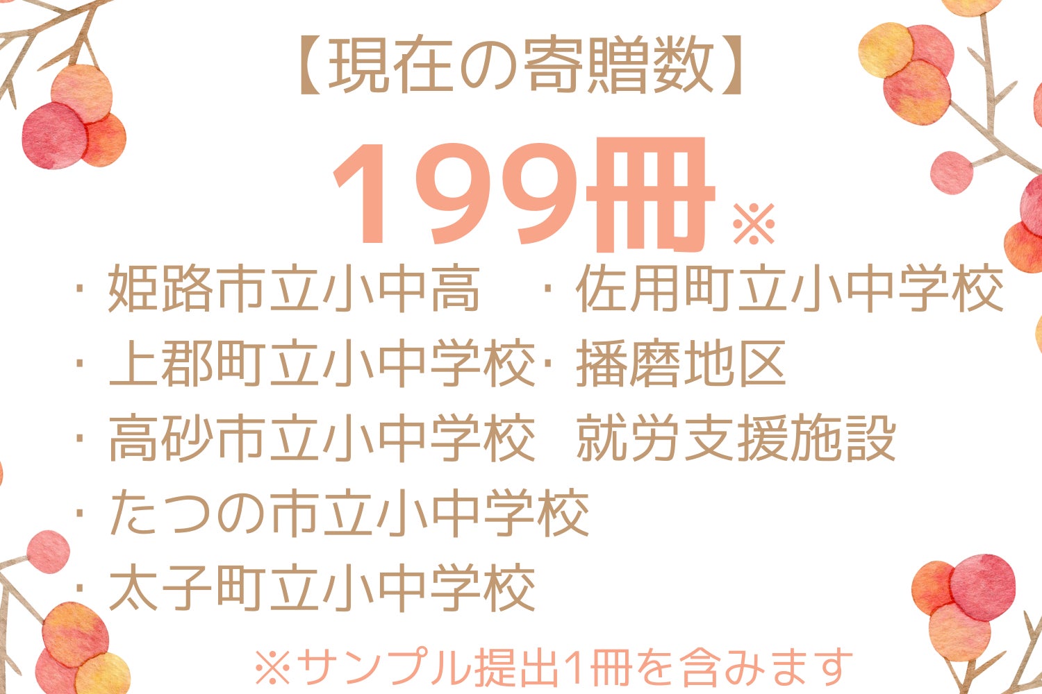 ※319冊は全てのお声かけをしております市町村の教育機関さまに寄贈を許可いただけた場合となります。