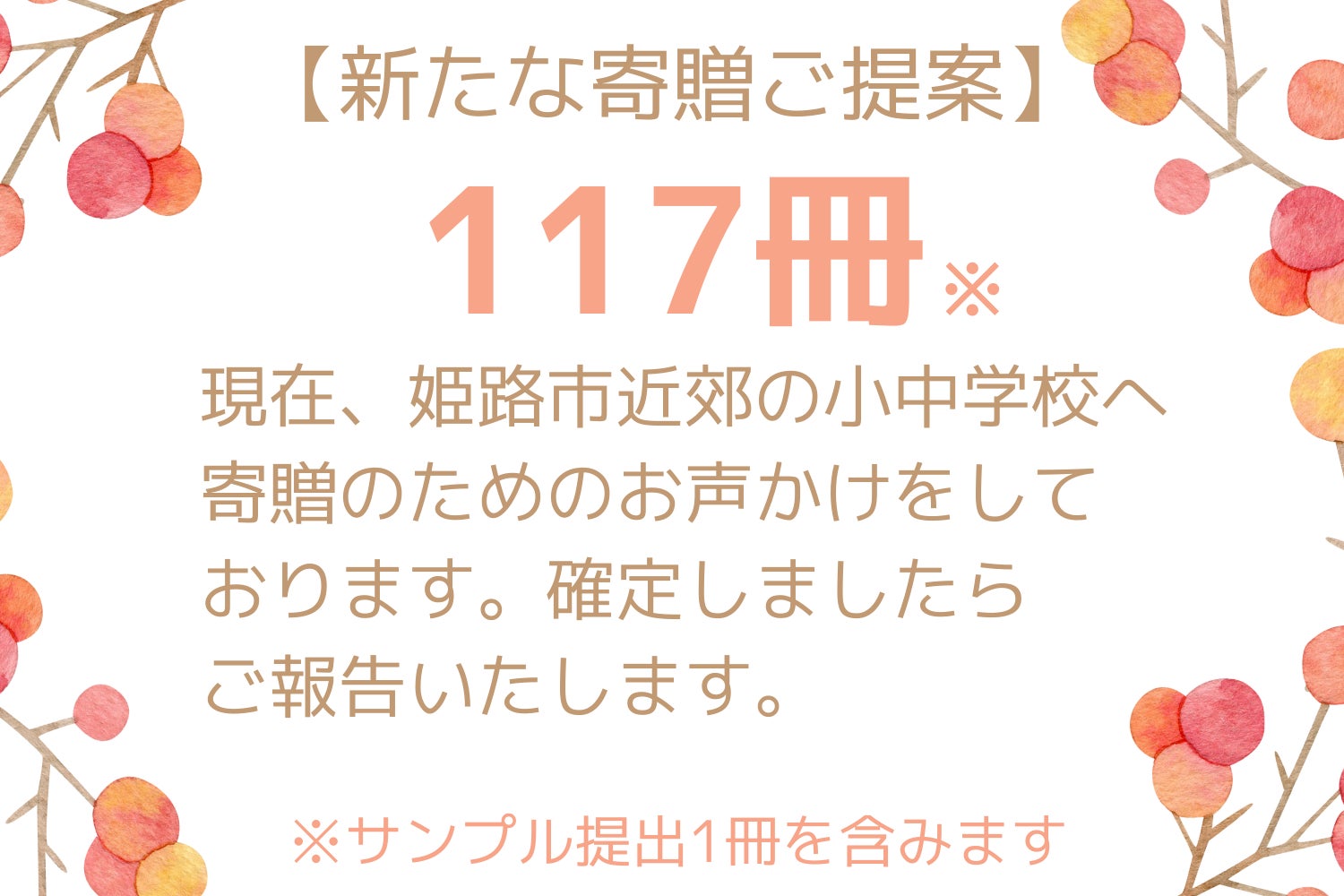 ※当初、そのように200冊を予定しておりましたが姫路市だけでなく、たくさんの小中学校のお子さまにもお喜びいただきたいと、眞砂と私の思いが溢れ・・・地域の市町村の教育委員会様にお声かけをさせていただいており最終の寄贈数は319冊になりそうです。