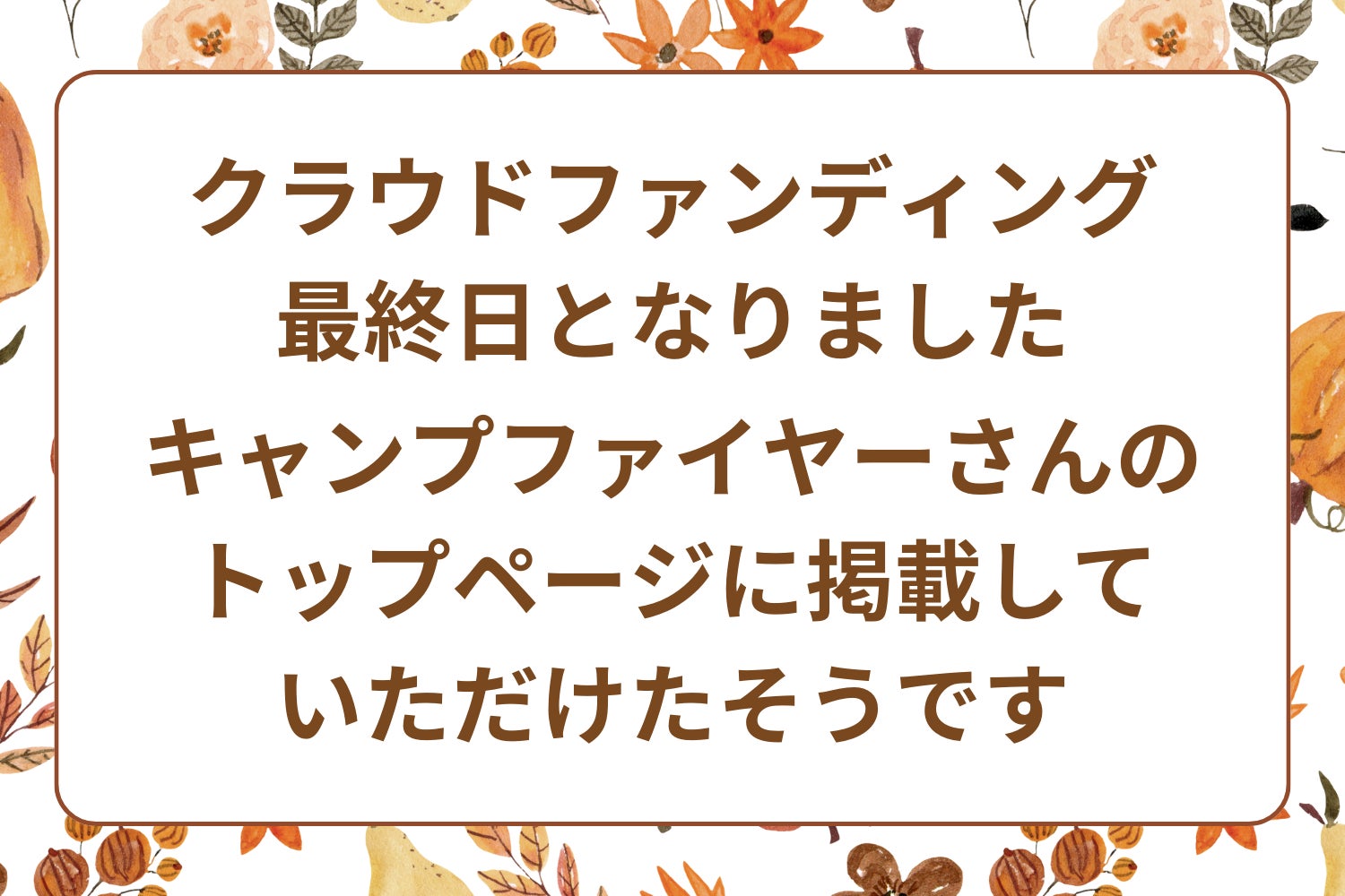 クラウドファンディング最終日&キャンプファイヤーさんのトップページに掲載いただけたそうです