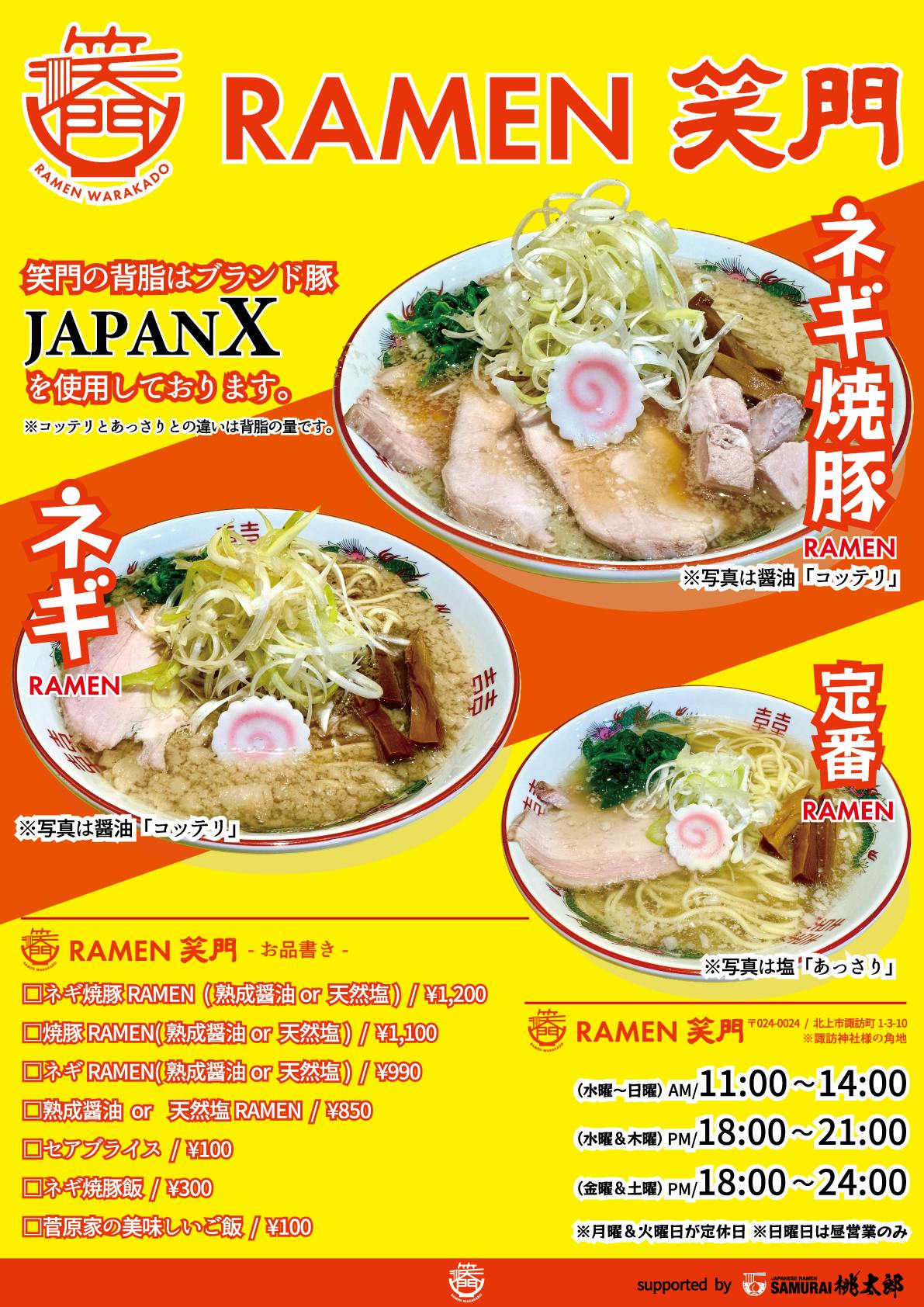 また、麺は「SAMURAI 桃太郎」にてRAMEN 笑門用の特注麺を作製してもらいます。