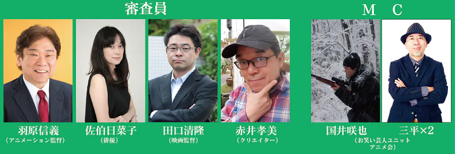 今年の審査員は、アニメーション監督の羽原信義さん、俳優の佐伯日菜子さん、映画監督の田口清隆さん、そして当実行委員会長の赤井孝美の4名。イベントのMCは、アニメ大好き芸人ユニット「アニメ会」の国井咲也さんと三平×2さんのお二人。上映中は作品の合間に絶妙なコメントで楽しませてくれます。