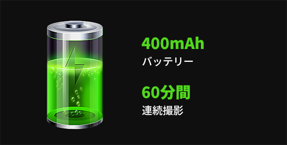 「Aomera」は400mAhバッテリーを内蔵し、フル充電した場合は最大約60分間連続撮影できます。
