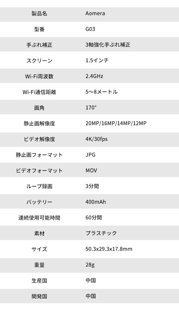 「Aomera」は、【4K/30fps】のビデオ撮影と【20MP】の写真撮影をサポートする超小型ミニカメラです。1.5インチのIPSタッチスクリーンを搭載しており、操作がより便利になります。さらに、3軸手ぶれ補正も搭載されており、撮影がより安定します。