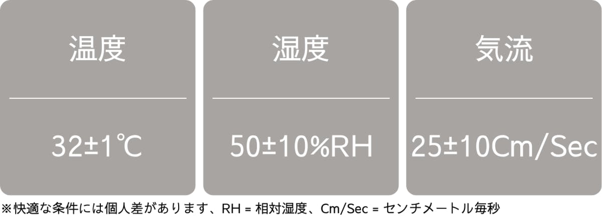 一般的には、衣服内が「温度:32±1℃」「湿度:50±10%RH」「気流:25±10cm/sec」の条件で満たされたとき。