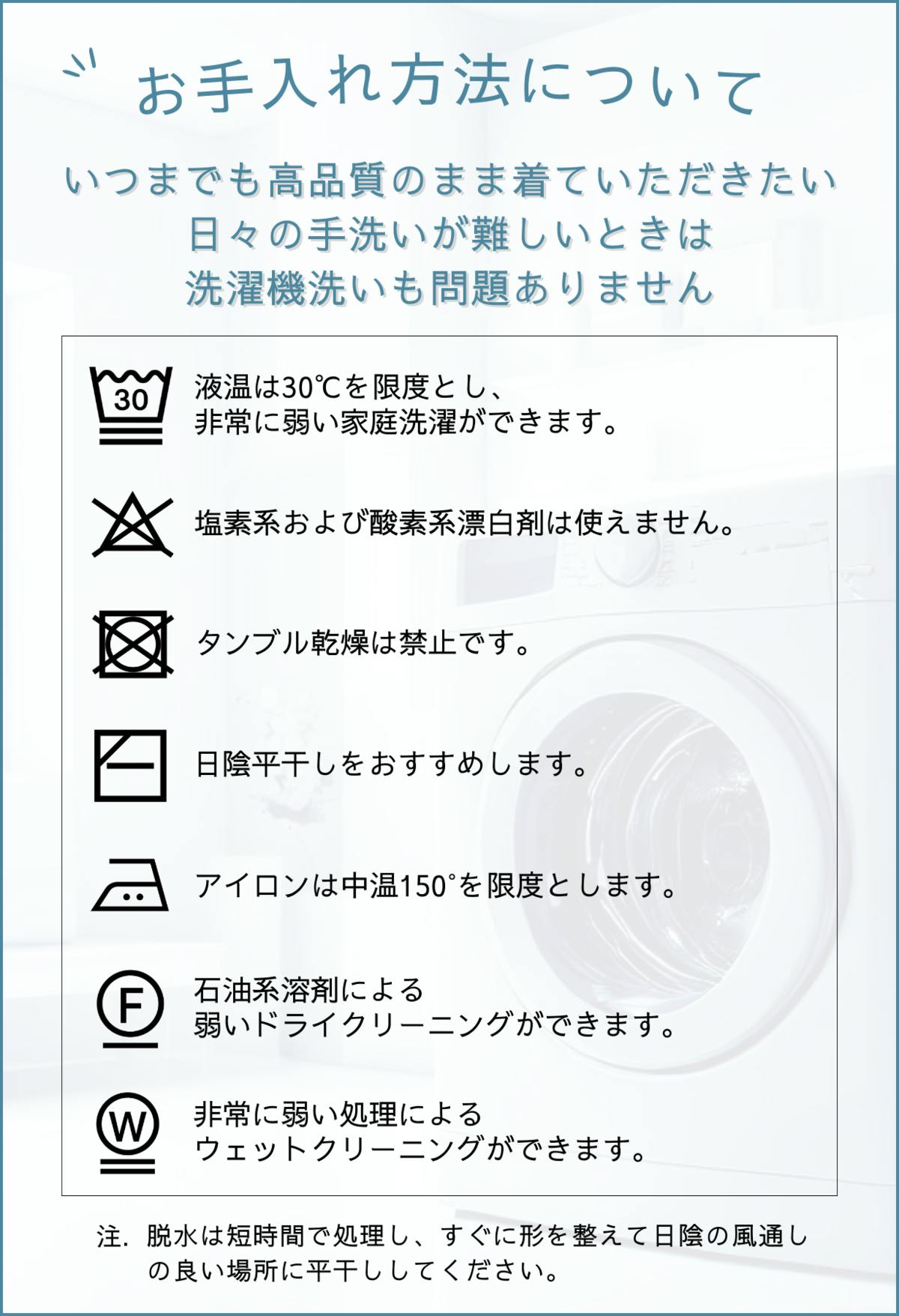 A2. 特別なケアは不要ですが、ニット商品のため洗濯・乾燥時のお取り扱いにご注意ください。詳しくは、「品質の誓いとお手入れ方法」に記載の「5つの品質ポリシー」と「お手入れの方法について」をご確認ください。