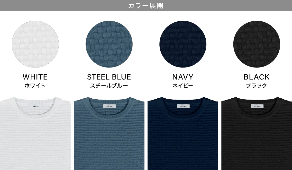 着回しやすさを考えた、4色展開。「ホワイト」「スチールブルー」「ネイビー」「ブラック」のシンプル色で、様々なボトムスやトップスと合わせやすく。