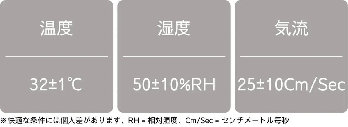 中でも重要なのが温度(肌の表面温度)。人がいちばん快適だと感じるとき、肌の表面温度は31℃〜33℃に保たれていると言われています。