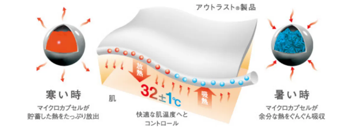 カプセル内の特殊相変換物質「パラフィンワックス」が温度変化に応じて液体→個体→液体と変化し、吸熱・蓄熱・放熱します。身体からの余分な熱を吸収し、寒くなると蓄えていた熱を放出するのです。