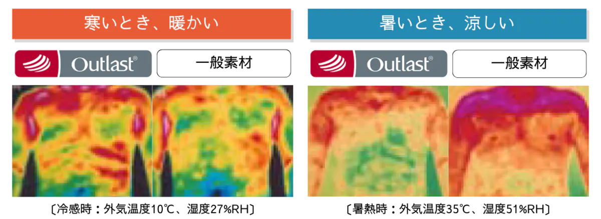 寒いときは身体の表面温度が高く。暑いときは身体の表面温度が低く。外気温や体内温度ではなく、人の肌の表面温度に直接働きかけ、理想の快適環境を作りだしてくれるのです。※アウトラストの機能性についての説明です。本製品での実証実験の結果ではございません。