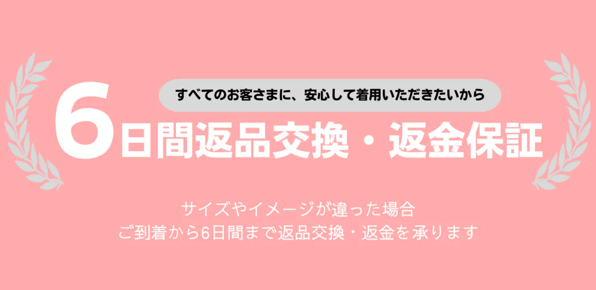 A9. お届け日から6日間の返品交換の保証をお付けいたします。返送料や手数料は当社が負担いたします。ただし、未着用品に限るため、商品のタグ等は必ず切らずにご連絡ください。タグが切られている場合は、保証対象外となりますので、予めご了承くださいませ。詳しくは、「安心の返品交換保証」をご確認ください。