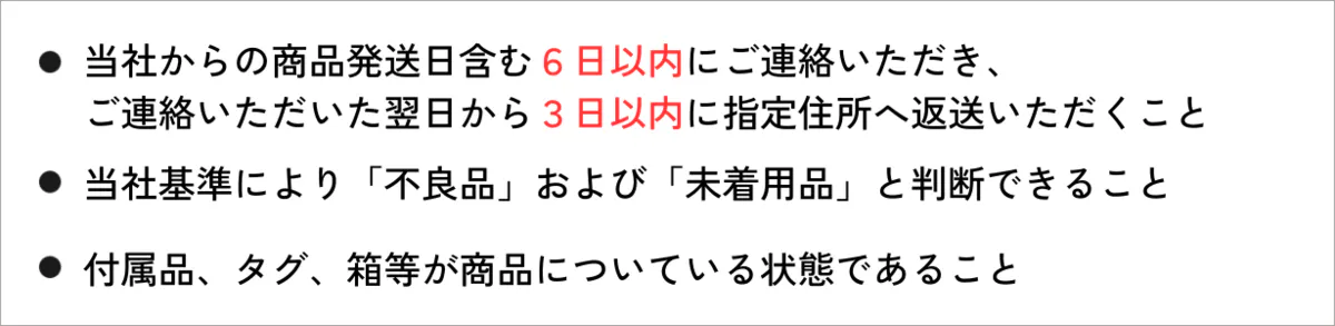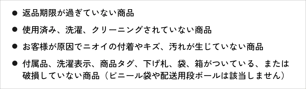 不良品や未着用品の場合は、以下の基準に該当した商品をご返送ください。