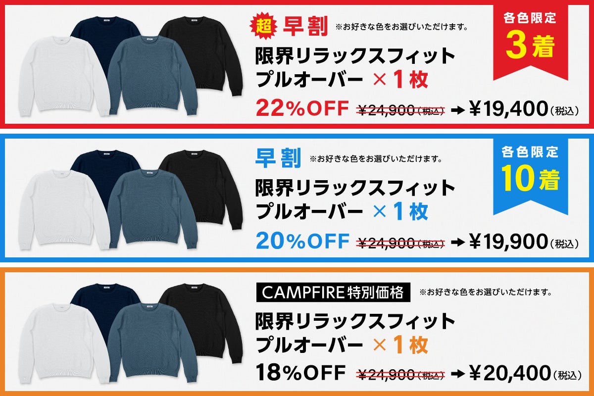 また、先着40名様(各色10点ずつ)に限り、開始したてのプロジェクトにご興味いただき、ここまでお読み下さったお礼として「CAMPFIREデビュー記念の早割」20%OFF、更に「超早割」として限定12名様(各色3点ずつ)に22%OFFをご用意しました!