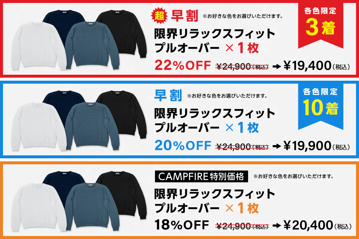 そこで今回、「お客さまに自信をもってご提供できる!」とプロジェクトメンバー全員が一致した商品だから、CAMPFIRE初出店として「限界リラックスフィット プルオーバー」として展開させていただきます!