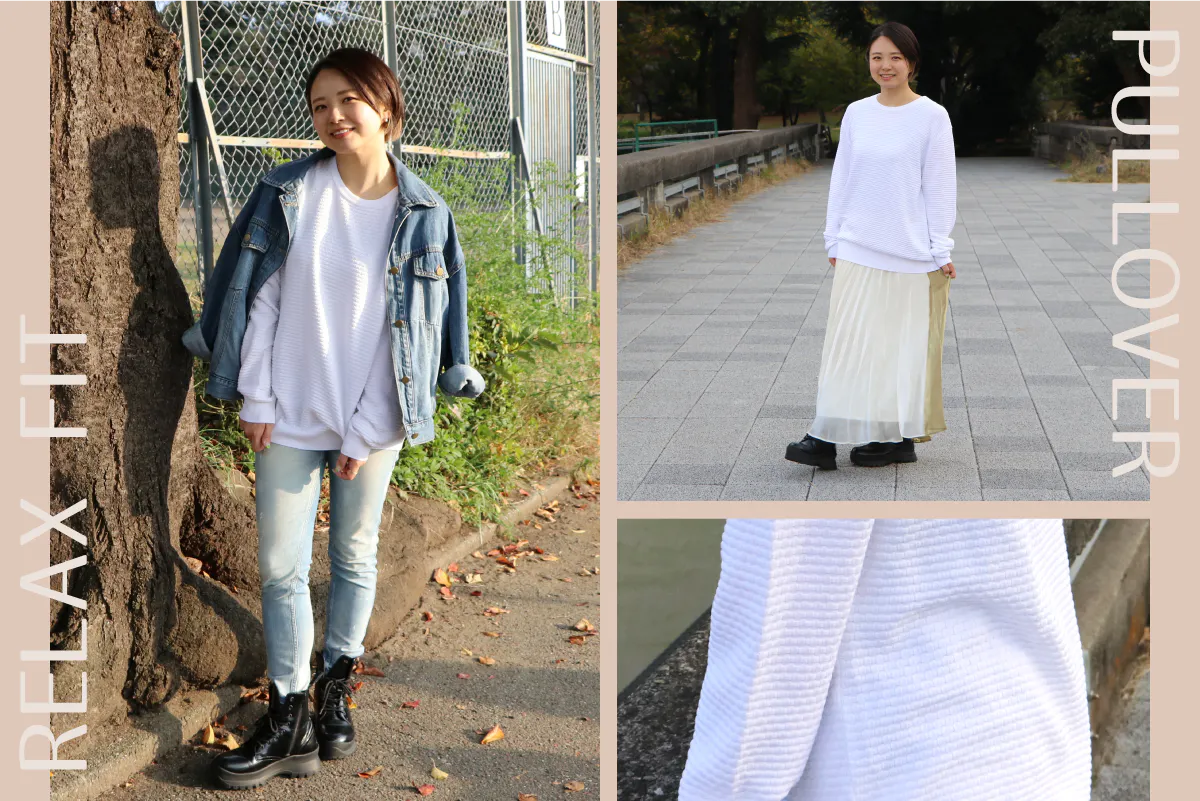 大人のプルオーバーは、ややオーバーサイズで抜け感を。トレンドのリラックススタイルを取り入れ、サイズバリエーションはS-XLまで広く4サイズ展開。