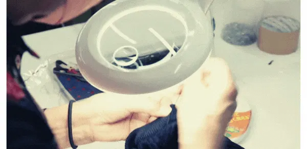 胴体や袖といったパーツを接合する「リンキング」。編み目の小さな輪と輪を同じ針に通す細かい作業。