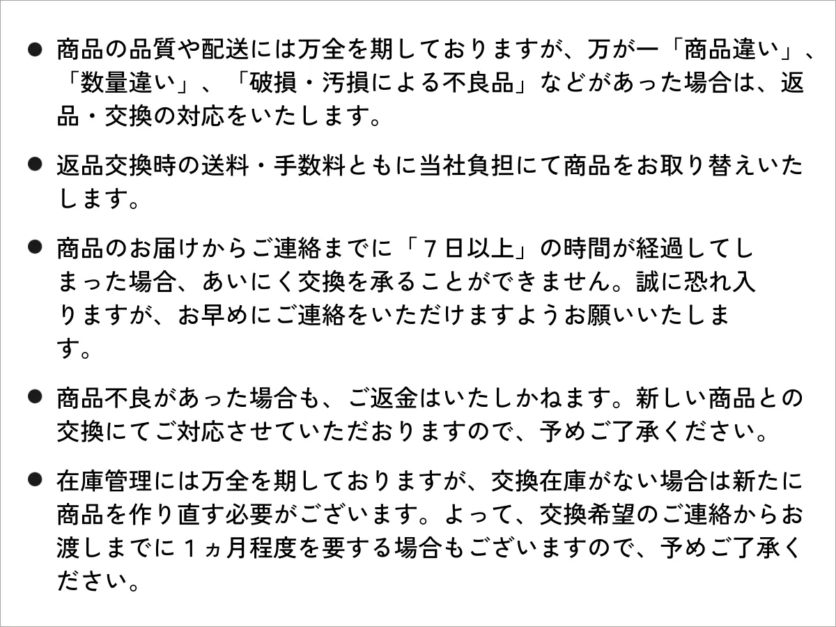 万一の不良品、色、サイズ、数量が異なった場合は、下の条件にもとづいて交換対応しております。