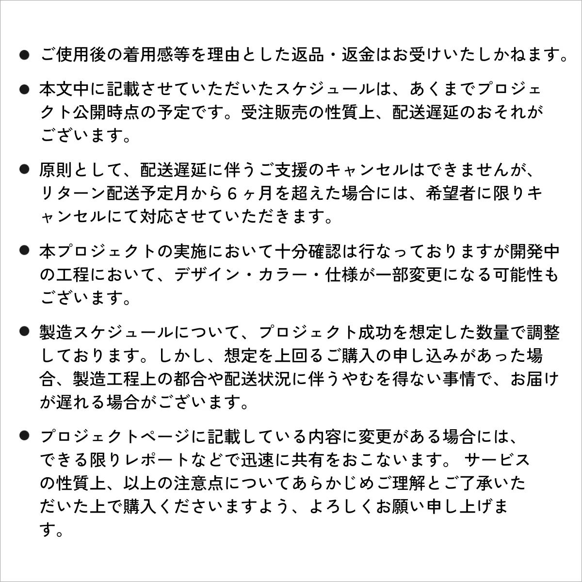「イメージと違う」「間違えて注文した」「商品の到着が遅い」などの、お客様のご都合による返品・交換はお受けいたしかねますので、あらかじめご了承ください。商品のご注文時には、商品の色、サイズ、価格、到着時期、プロジェクト詳細をよくご確認のうえ、ご注文いただけますようお願い申し上げます。
