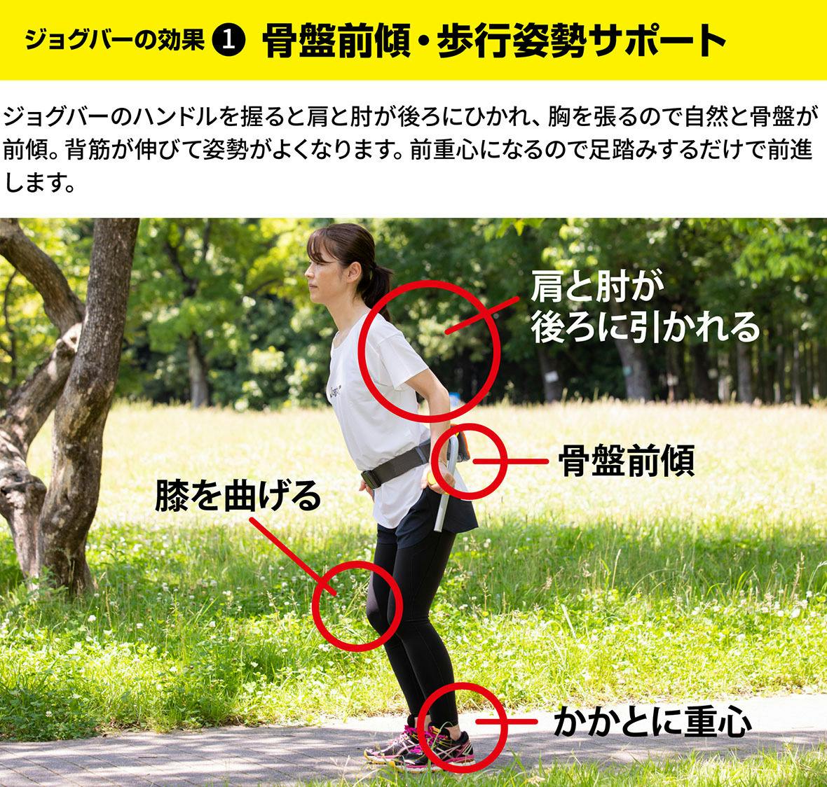 骨盤が前に押されるので前傾し、重心が前に移動する。ジョグバーを装着すると足踏みするだけで前に進みようになる。