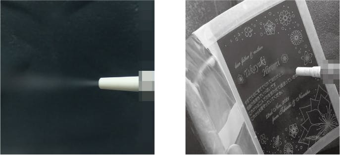 ガラス工芸で使うときは、圧縮空気に研磨材となる「砂」を混ぜてガラスに吹き付けると、砂が当たった部分がザラザラの磨りガラス状になります。