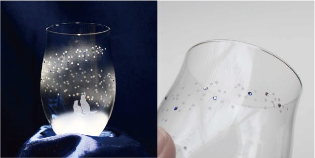 透明感のあるグラスに、ラインストーンで表現された星座のデザインがきらめいて、飾っても使っても楽しいグラスになりました。
