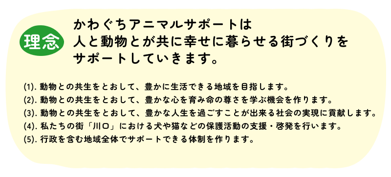 いっぽう日本では、動物虐待の痛たましい事件やペット産業における違法行為があとを絶ちません。その状況を一気に変えることは難しいかもしれないけれど、埼玉県川口市から動物にやさしい輪を広げていきたいと強く願っています。