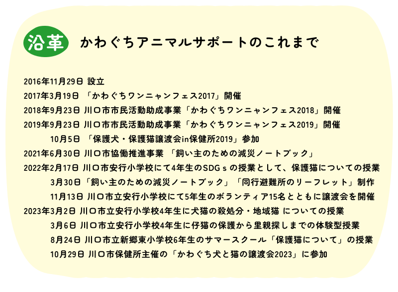 そのときに保護活動をしている方々が苦労している現状を直接お聞きし、何かもっと出来ることはないかと考えるようになったのが、かわぐちアニマルサポートとして活動するきっかけです。