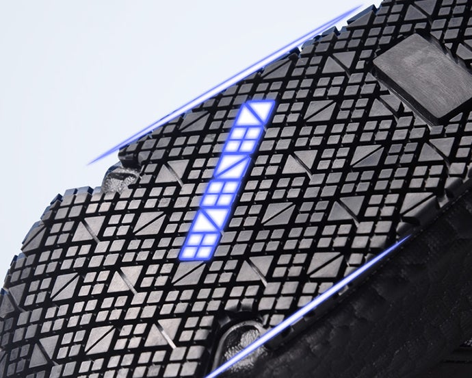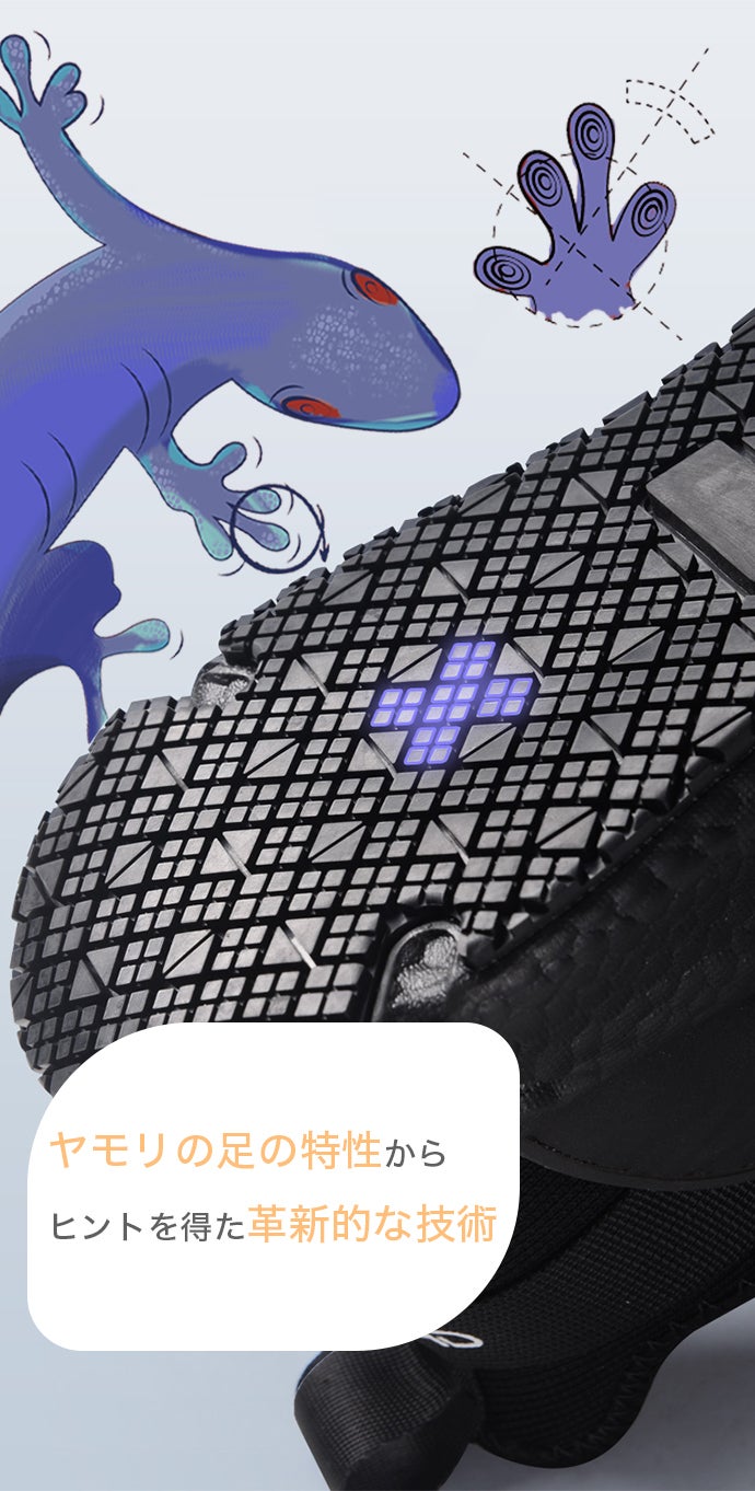 厨盾(キッチンシールド)チームはヤモリの足の特性に注目し、スニーカーのアウトソールにも、このような特殊なパターンや溝を配置することで、地面との摩擦を増やし、驚きの耐滑性を実現しました。