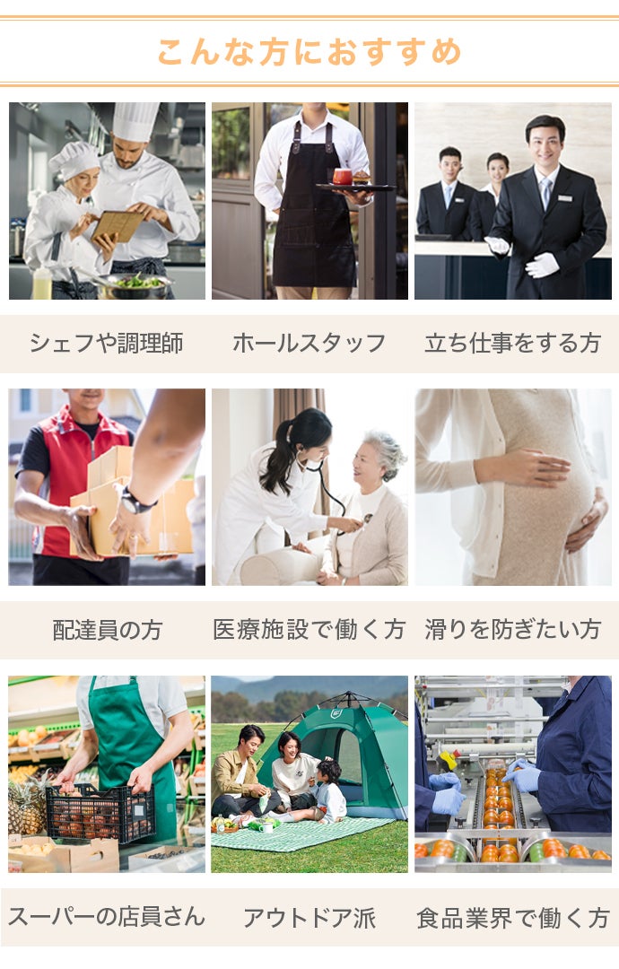 普段使いはもちろん、キッチンや飲食業界、医療現場や清掃業、倉庫作業など様々な環境で大活躍します。