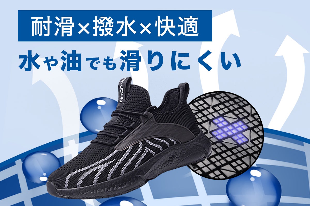 厨盾(キッチンシールド)スニーカーは、独自に開発された特殊なソール素材とヤモリのバイオミメティクス(生物の構造や機能を工学的に模倣した技術)により、滑りを最小限に抑え、あらゆる路面で安定感抜群の歩行をサポートします。
