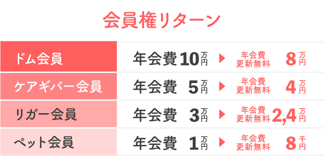 「年会費更新料永久無料」+「割引価格」ですがもちろん各会員権の特典はお楽しみいただけます。