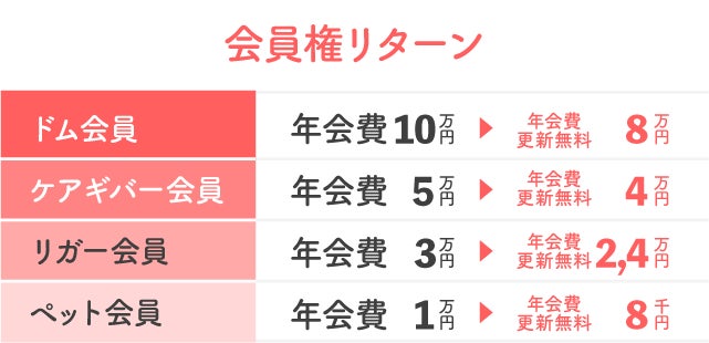 「年会費更新料永久無料」+「割引価格」ですがもちろん各会員権の特典はお楽しみいただけます。