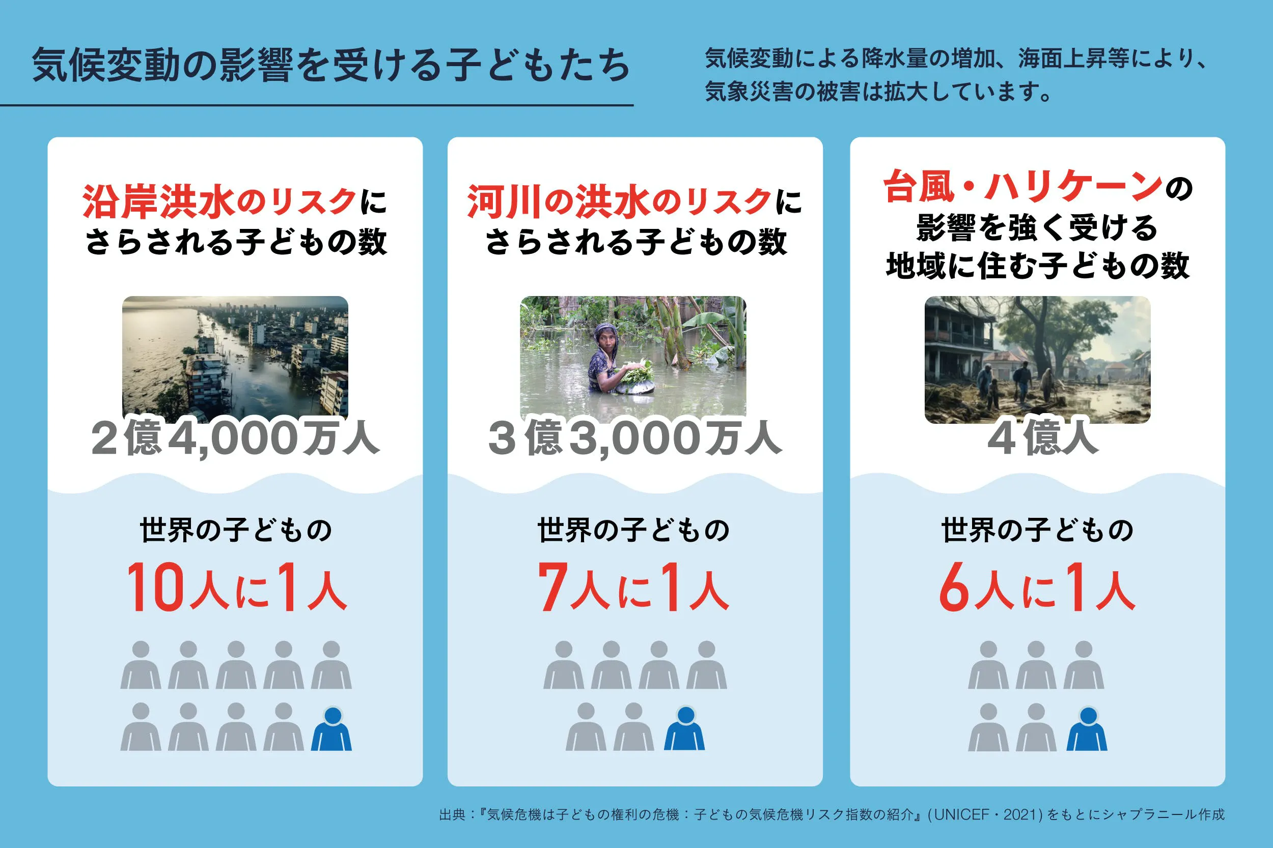 ユニセフによれば、気候変動の影響を受けるリスクが「極めて高い」とされている子どもの人数は約10億人。これは世界の子どもの半数にもあたる人数なのです。