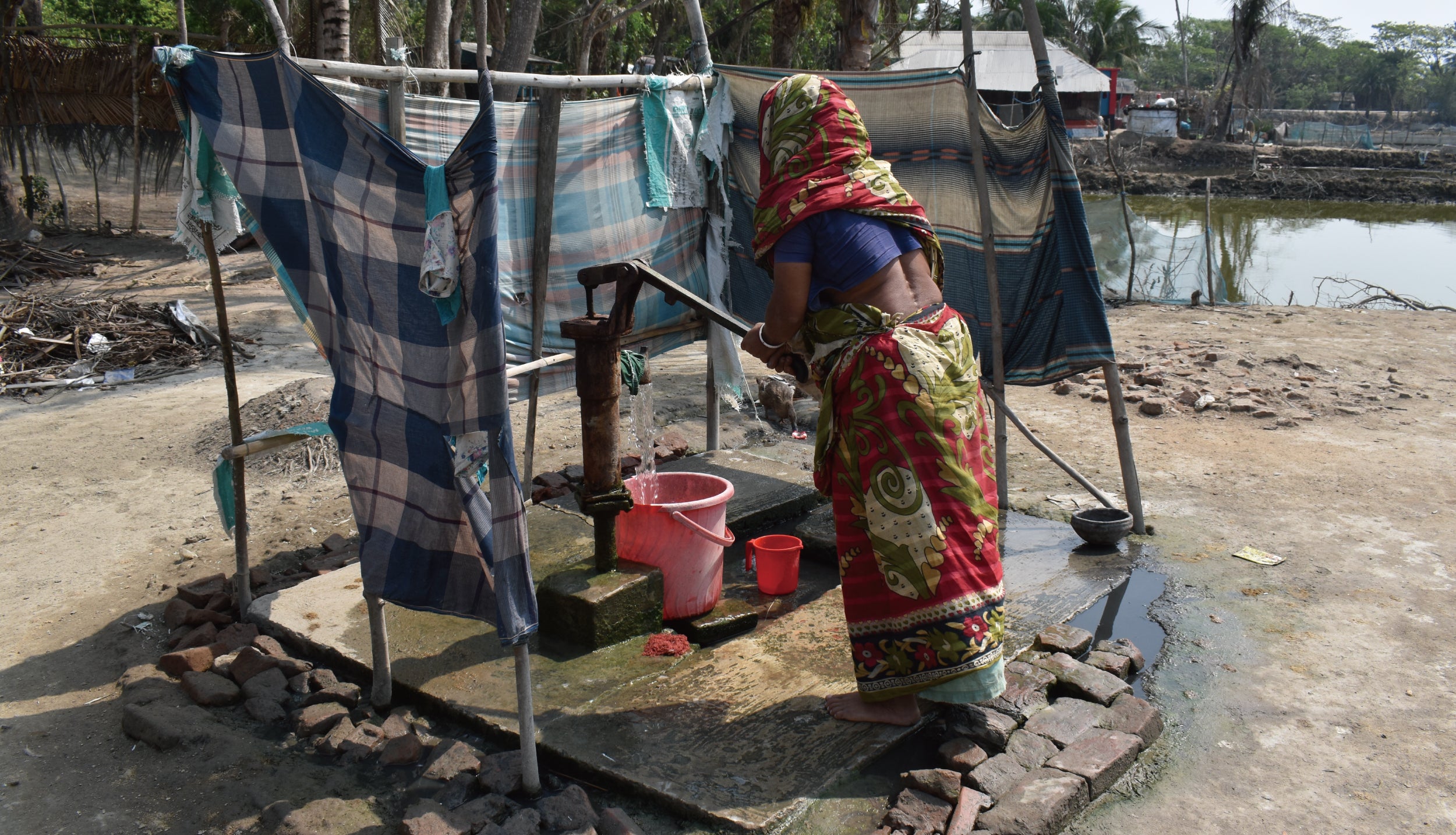 水汲みをする女性。海面に近い場所は災害時に井戸に海水が流れ込み、飲み水の確保が困難になる。