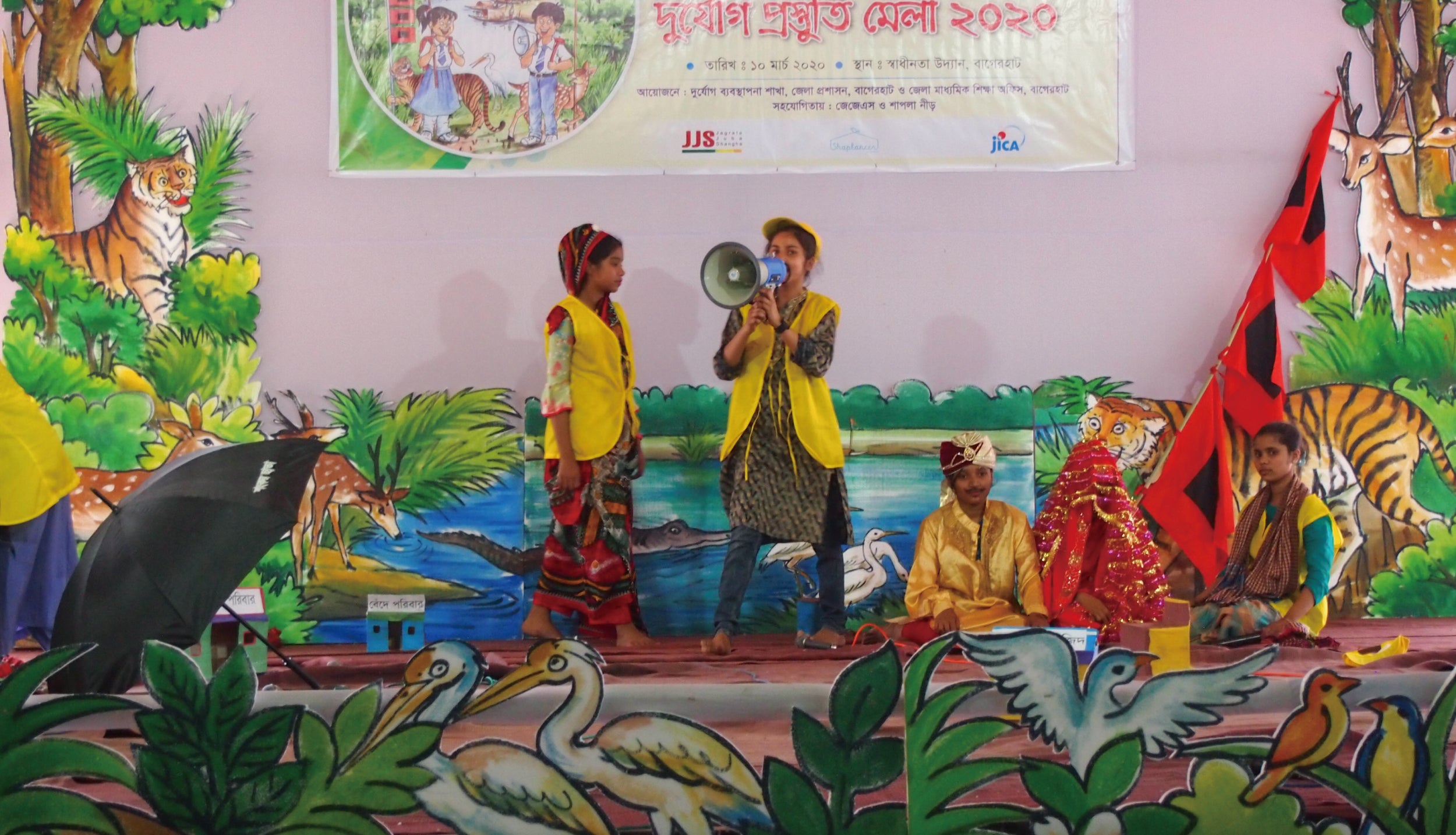 防災コンテストで、子どもたちが演劇を通し防災メッセージを伝える様子(バングラデシュ)