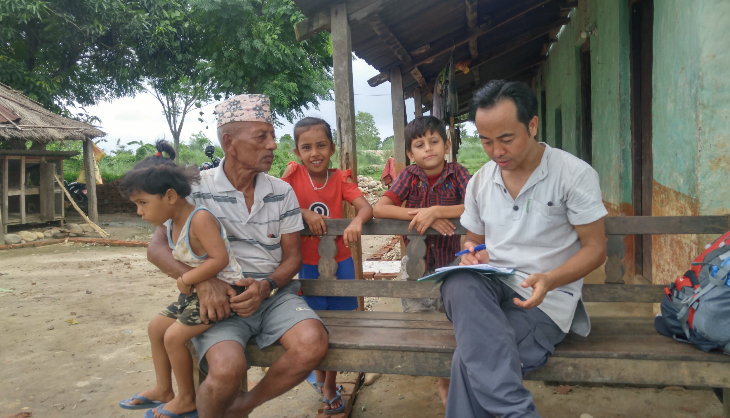ネパールの活動地で地域住民と対話するシャプラニールスタッフ(右)