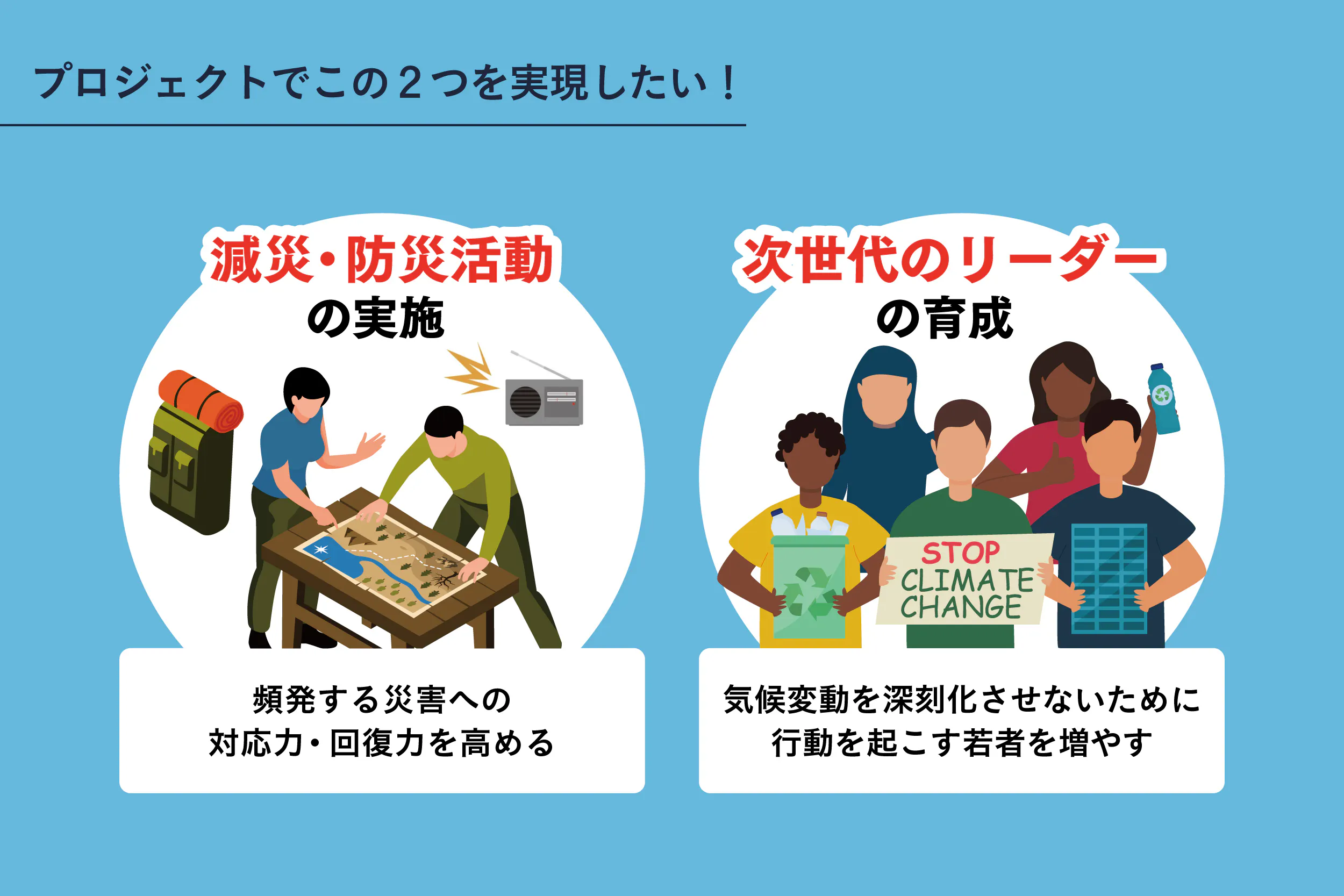 このプロジェクトでは、「防災・減災活動」と「次世代リーダーの育成」の2つのアプローチを通して「気候変動×子ども」の課題に取り組みます。